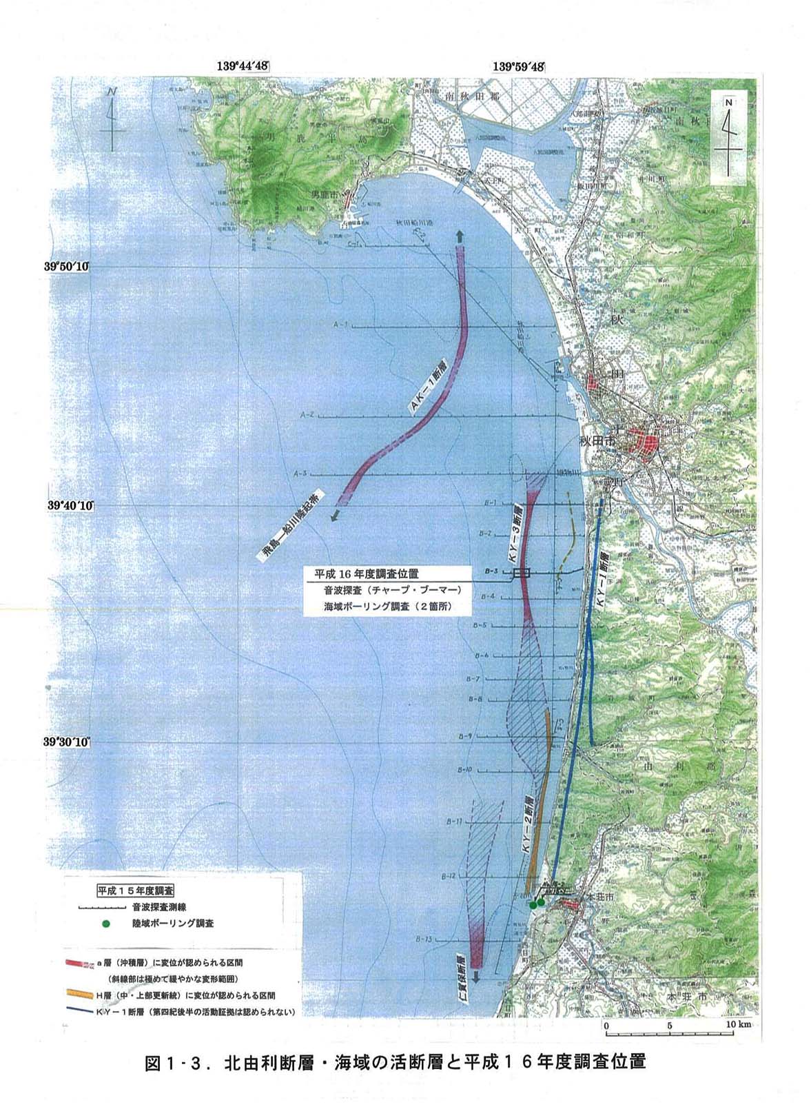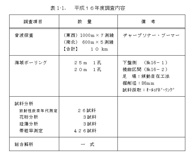 平成14年度調査(陸域の地表踏査及び海域における既存反射法地震探査の再解析)により、活断層としての北由利断層は、陸域ではなく海域に位置している可能性の高いことが判明した。この結果を受け、平成15年度には、海域に推定された北由利断層の位置や浅部構造等を明らかにする目的で音波探査等を実施し、沖積層あるいは上部更新統相当の地層に変位を与える活断層が見つかった(KY−2断層、KY−3断層)(図1−3)。特にKY−3断層は、沖積層と推定される地層の撓曲構造から判断し、複数回活動している可能性が高いことも判明した。平成16年度調査は、本調査の総括として北由利断層の総合評価に重要な意義を持つKY−3断層の活動性及び活動履歴の解明を目的とし、図1−3に示した位置において音波探査、ボーリング調査および試料分析等を実施した(表1−1)。