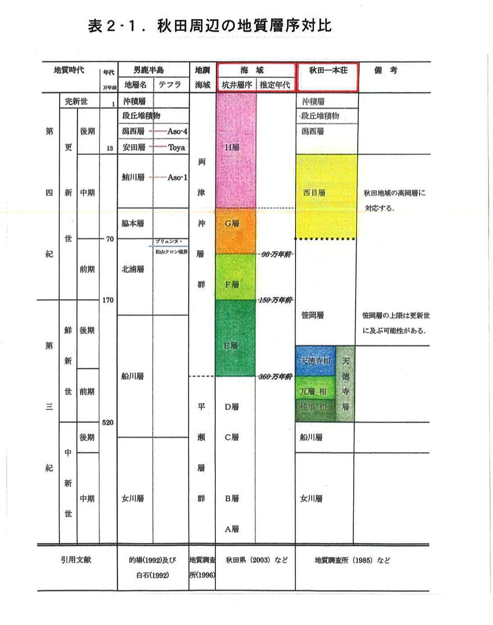 調査の結果、当海域の地質層序(有孔虫化石等により下位からA層、B層・・・最上位のH層まで8層に区分)は、秋田周辺丘陵地域の地質層序と表2−1のように対比されることが明らかになった。また、反射記録から、当海域における断層は図2−1のように推定される一方、陸域の北由利断層は、第四紀後半に活動した証拠は認められず、活断層ではないと評価された。