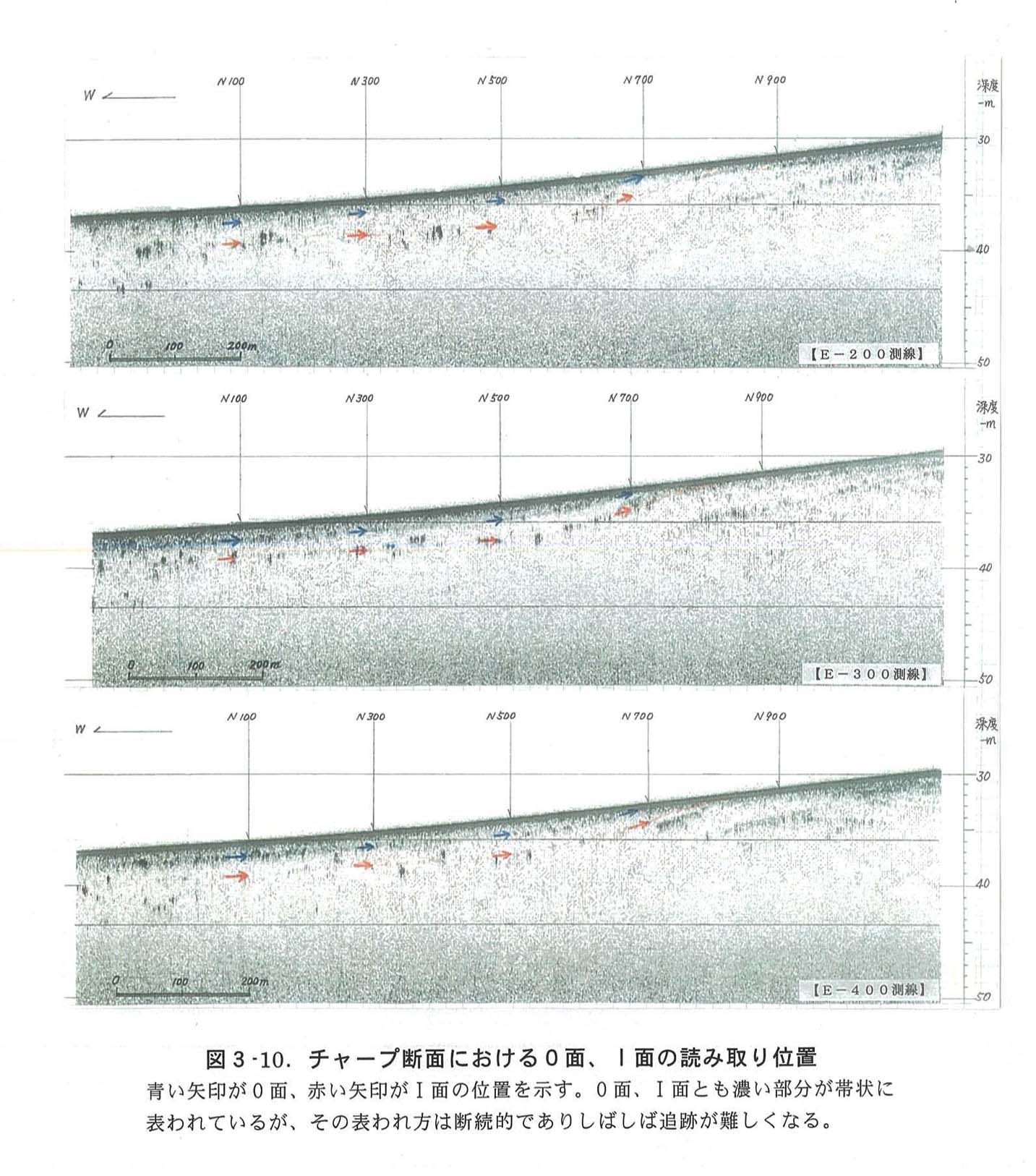 チャープソナーによる音波探査断面では、ブーマーの探査断面では追跡が困難であったT面が断層により変形している可能性が高いこと、さらに海底直下に新たな反射面(0面)も表れており、0面も変形している可能性があることが判明した(図3−9)。なお、主な断面における0面、T面の位置と表れ方を図3−10に示した。