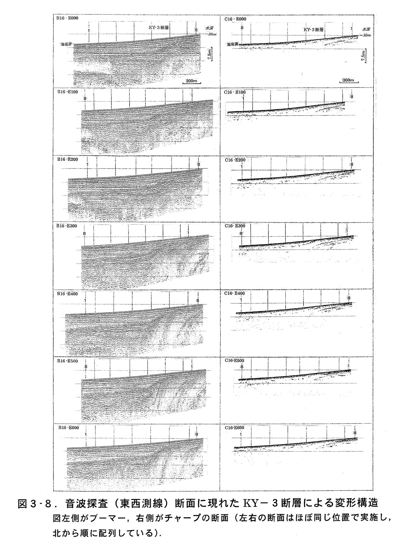 図3−8.音波探査(東西測線)断面に現れたKY−3断層による変形構造