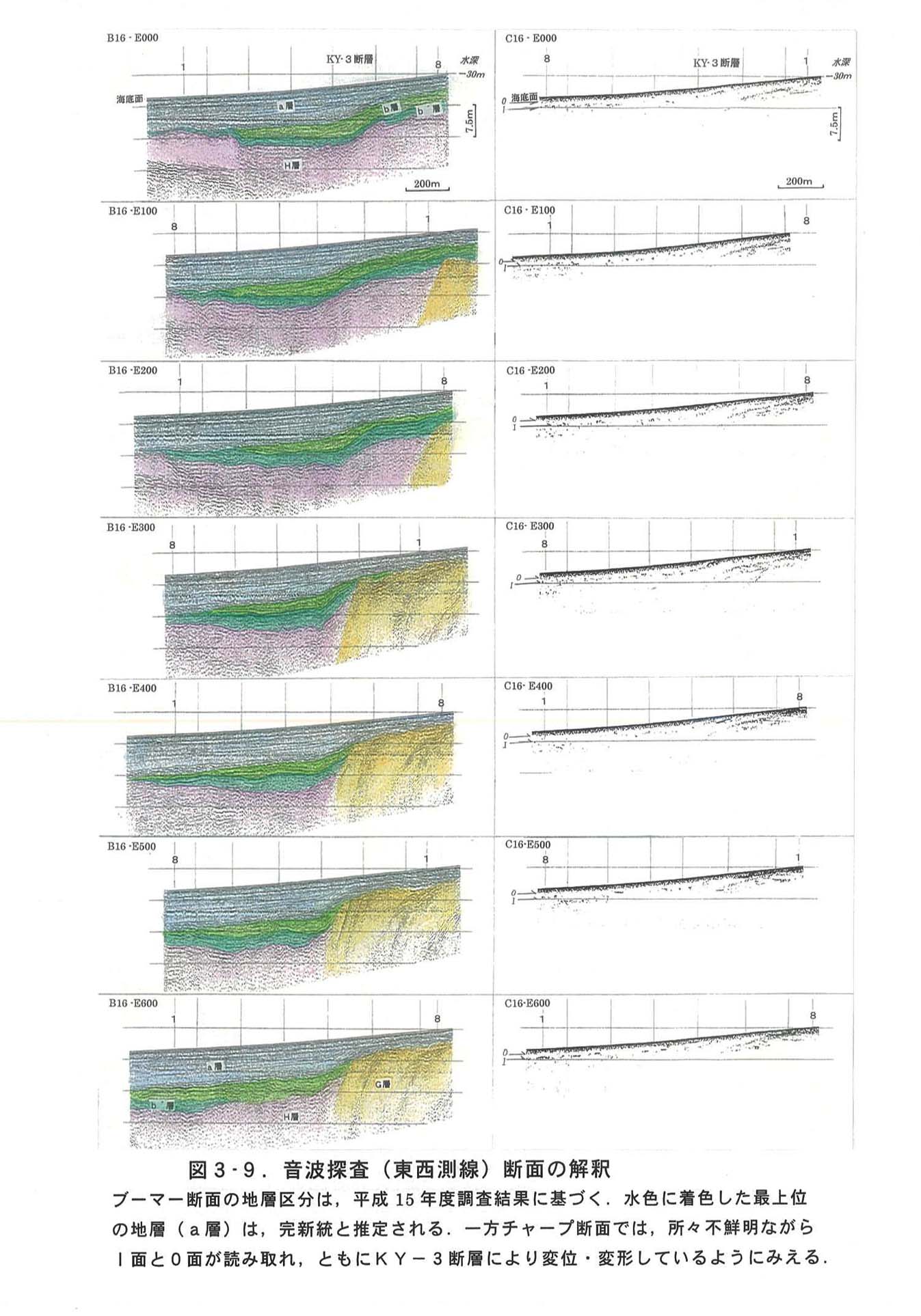 ブーマーによる音波探査断面では、ほぼ推定された位置で沖積層に及ぶ変形構造が認められた。平成15年度実施したB−3測線とほぼ一致するE−300測線においても沖積層中の反射面及びその変形構造が良く表れており(図3−9)、KY−3断層の活動が、a層堆積開始以降、複数回活動している(変位の累積性が認められる)可能性が高いことが再確認された。
