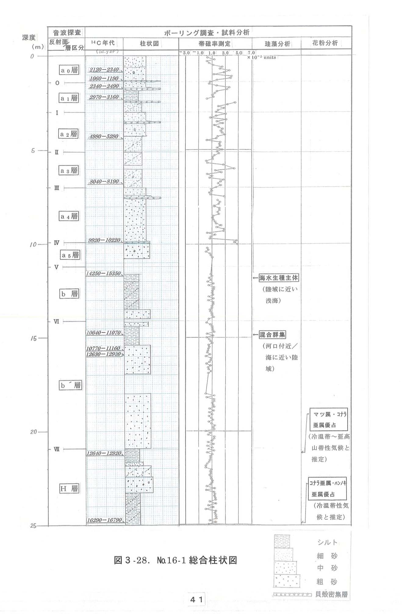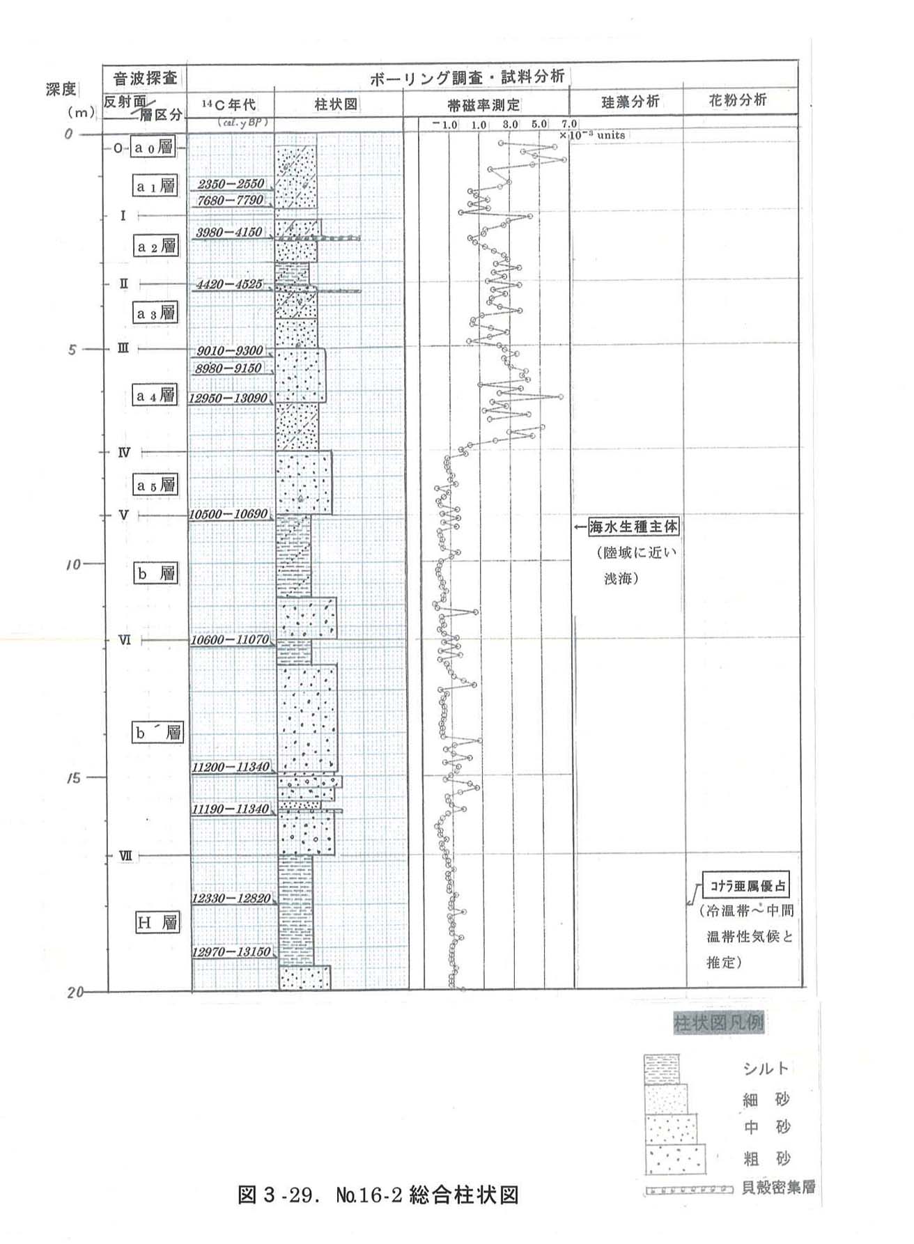 試料分析の結果は、総合柱状図として図3−28、図3−29に示す。これらの調査により、各層の堆積年代(暦年代)および堆積環境は表3−5のように推定される。