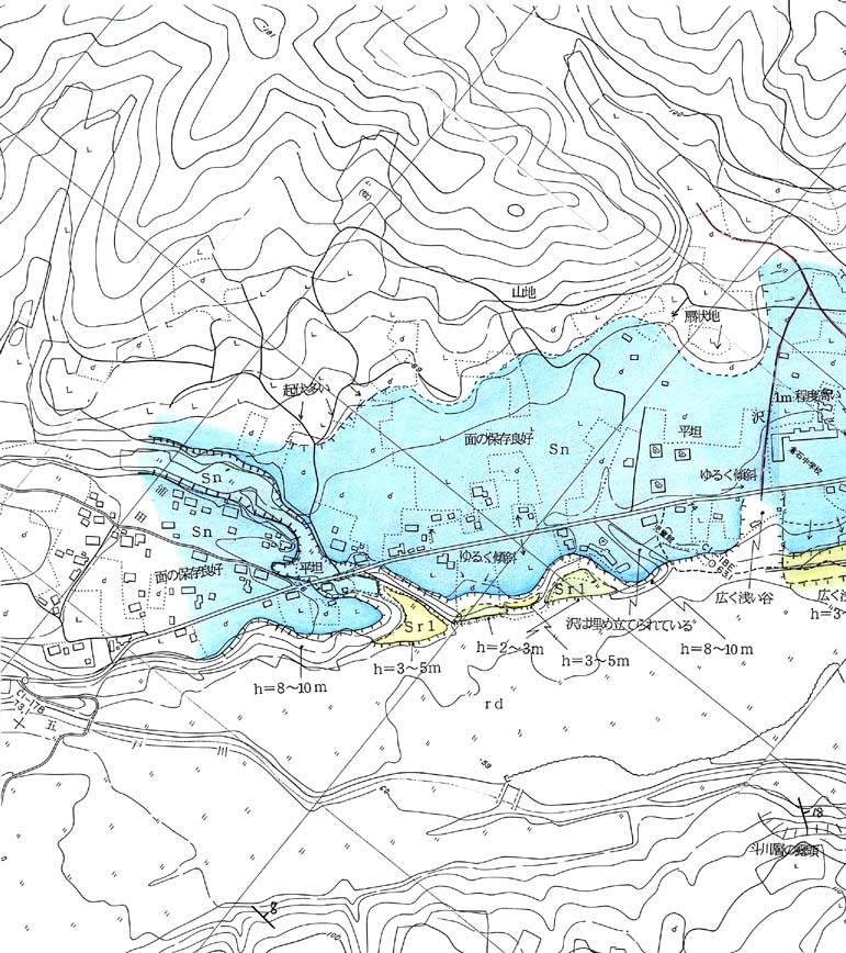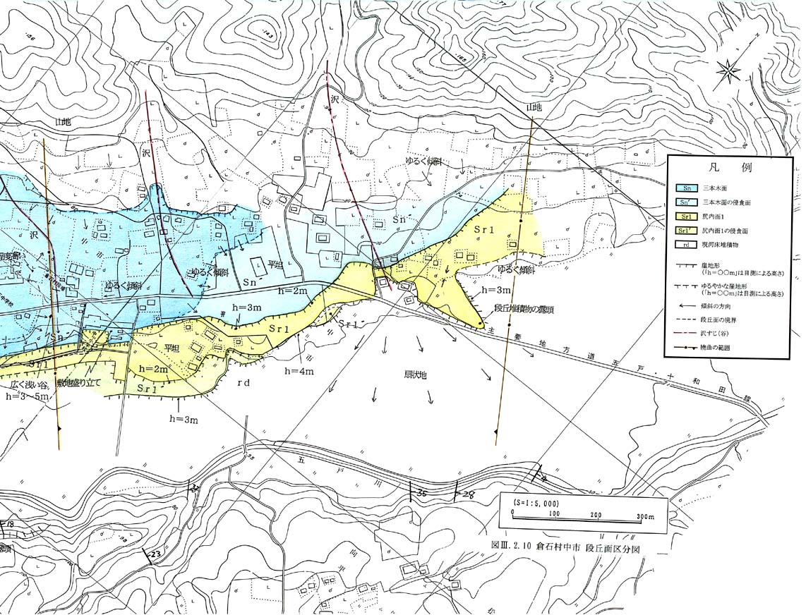 地形地質精査の結果は以下の通りである。三本木面は標高約70〜80mに分布する。倉石中学校付近より西側では、三本木面は面の保存が良く非常に平坦であるが、倉石中学校付近から東側では、北側の山地からの小河川によると思われる、深さ2〜5m、幅60〜80mの谷地形(沢すじ)が数条認められ、起伏が大きくなっている。また、三本木面の浸食面であると考えられる、三本木面よりも一段低い面が中市小学校の東方に認められる。更にその東には尻内面1の形成以降の、かなり新しい扇状地が認められる。尻内面1は標高60〜70mに分布し、倉石中学校よりも東側に広く分布する。非常に平坦で、集落・水田になっている。また、尻内面1よりも2〜3m低い、尻内面1の浸食面も分布する。