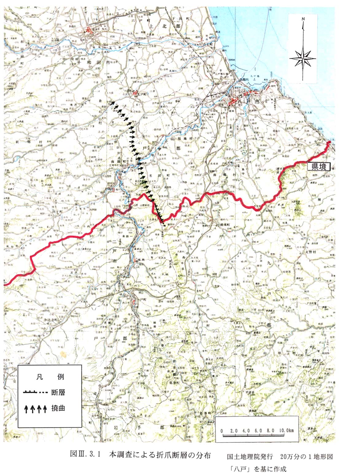 名久井岳東麓の直線的な急斜面とほぼ同じ位置に中新統の急傾斜(一部逆転)構造があり、県境から3.6kmの範囲では西上がりの逆断層であると推定される。それより北方、馬淵川南岸までは露出が悪く不明であるが、馬淵川より北方では倉石村中市の五戸川まで、中新統および鮮新統の撓曲構造として追跡され、中市以北ではその撓曲も消滅する。折爪断層の分布は、青森県側では約21kmである。