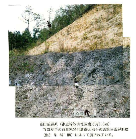 この地区では、進成時の地質観察によって古期段丘構成層が、県道勝浦宗像線付近まで広がっていることが確認された。この分布の西方延長は、沖積面下に没していると推定される。この地区の南方約 1.3qのリニアメント延長部で、白亜紀の関門層群と古第三系が接している断層露頭が見出された(図2−2−3−1、写真2−4−3−2)。これは、いわゆる基盤断層であるが、走向N45゜W、傾斜62゜NWであり、西山断層系のトレンドとほぼ同じである。