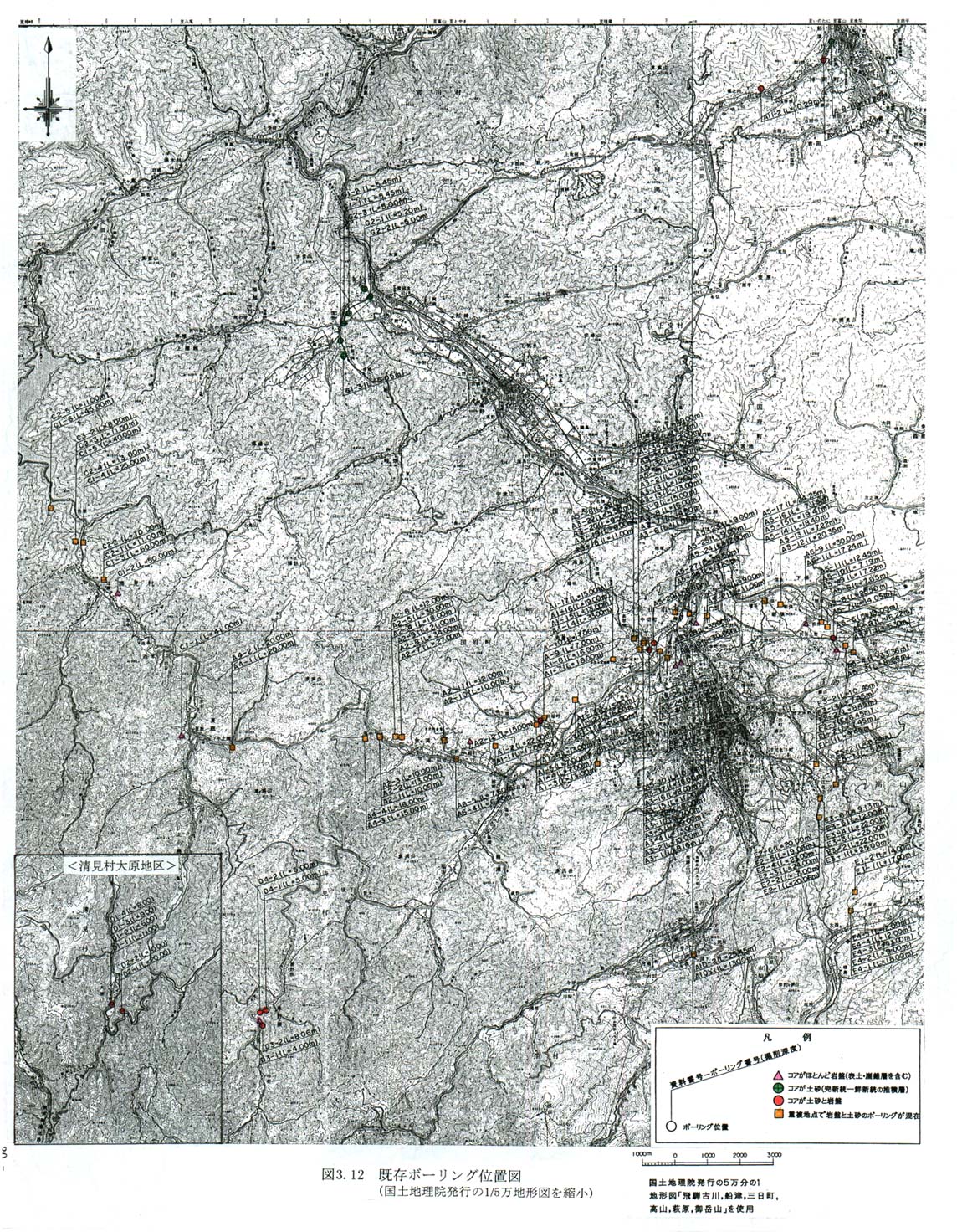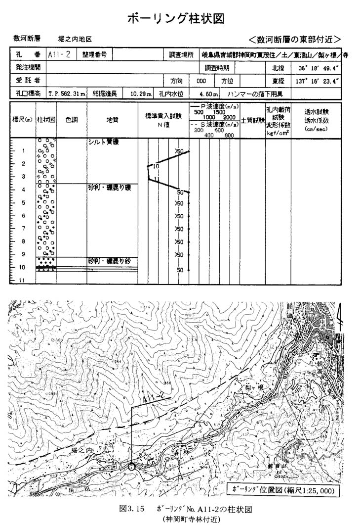 ボーリングの掘削深度は5.0〜60.0mであり,総本数168本の内の多くは「崖錐堆積物+岩盤」の組み合わせを掘削している。活断層の検討に有効なボーリング地点は,断層を挟んだ両側に位置し土砂層(完新世〜おそらく鮮新世の堆積層)もしくは土砂層と岩盤とを掘削した箇所,及び盆地内で土砂層の基底標高や厚さを知ることができる箇所である。この観点から,断層に関連すると思われる箇所について以下に示す。