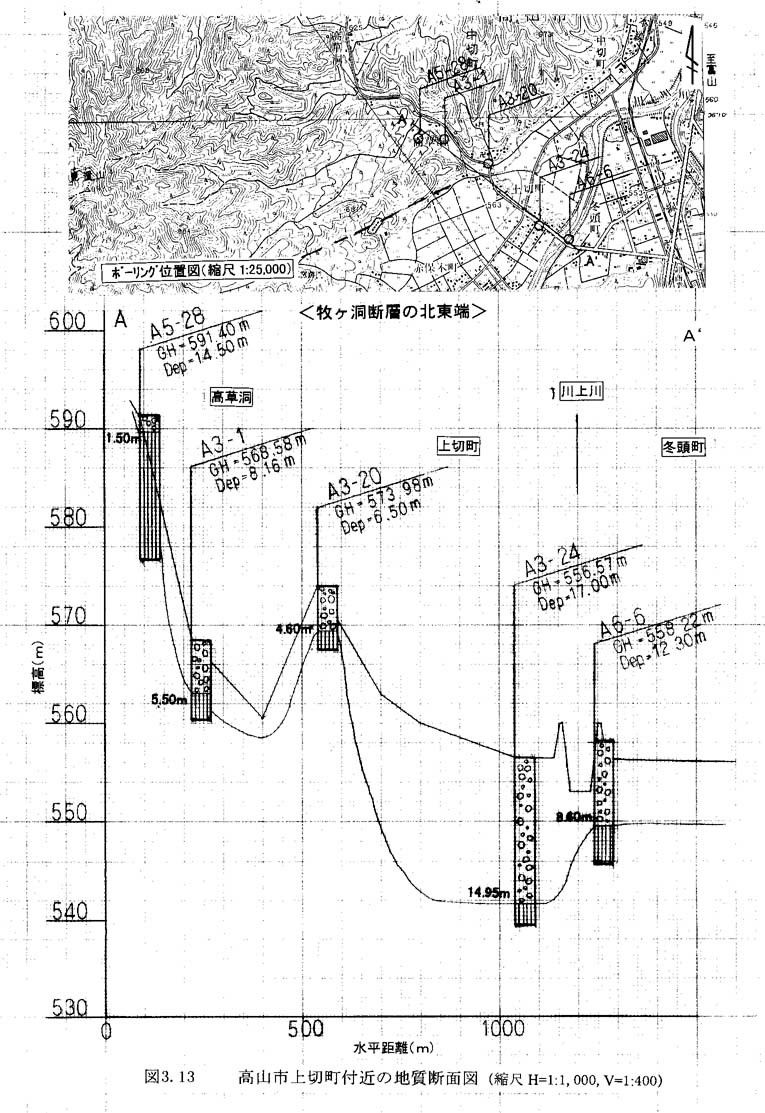 @ 図3−13に示すように牧ヶ洞断層の北東部に当たる高山市中切町で断層を横断する測線を得たが,断層に関連した情報は得られなかった。ボーリングb`3−24によると,この付近の川上川の沖積層の厚さは最大で約15m,基底標高は542mであった。