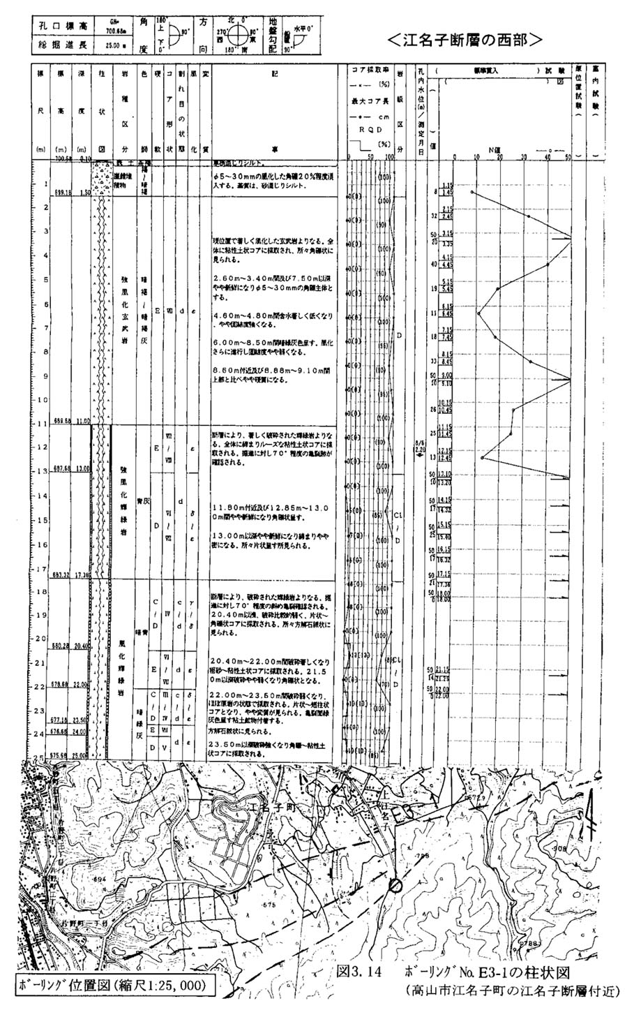 また,ボーリングbd3−1(図3−14)や付近ボーリングには,美濃帯の輝緑岩や玄武岩中に破砕帯が見出され,120mの間に幅30mと20mの破砕帯が推定されている。この破砕帯はリニアメントが通る付近に位置する。