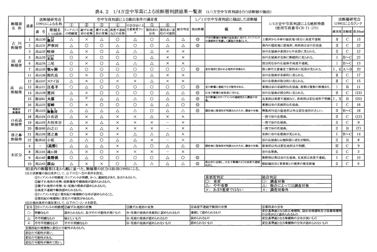 確実度Tの断層で選択しなかった断層は,夏厩断層,三尾断層,猪之鼻断層である。前2者は変位地形は明瞭であったが,第四系の分布が少なく,また第四系が変位していることが認められなかったためである。猪之鼻断層は長い活動史を持ち,多数の断層変位地形が観察される断層(山田ほか,1985)であるが,明らかに第四系(最近の時代)に変位を与えている地形は認められなかった。
