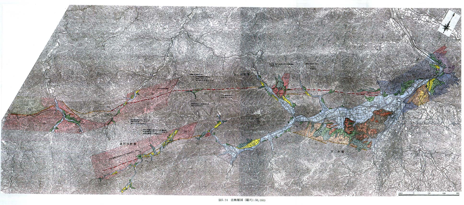 また,大倉滝北側の小盆地でも,分離した小丘が連続する特異な地形を示すとともに,小丘間を埋積する谷底堆積物に直線的な低崖や水系の屈曲が認められるため,完新世(ないし完新世に近い時期)に活動していたことはほぼ確実であると考えられる。したがって上記の区間と河谷,尾根の系統的な屈曲が認められる区間に活断層の存在が推定される。