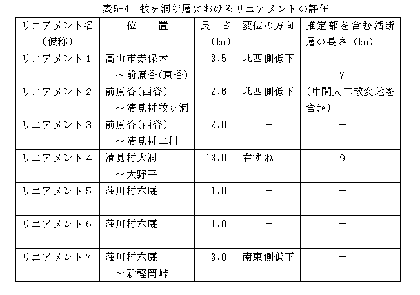 表5−4 牧ヶ洞断層におけるリニアメントの評価