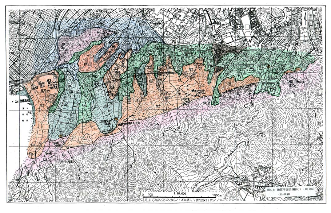 に示す。その結果丘陵地を構成する原山礫層(G2)と山地を構成する流紋岩(Ry)は,直線的な境界をなすものの,断層露頭は確認されていない。また沢部に分布する扇状地(Fd1,Fd2)に断層崖を示唆する崖や地形変換点は伺えなかった。