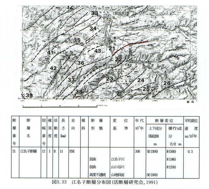 活断層研究会(1991)によると,江名子断層は図5−33に示すように,高山市滝町根方地区より西方に連続し大八賀川を横断し,塩屋町南部・江名子町南部を経て高山市南部を北流する宮川の東側まで達しており,長さ11q,確実度T,活動度B級と評価されている活断層である。