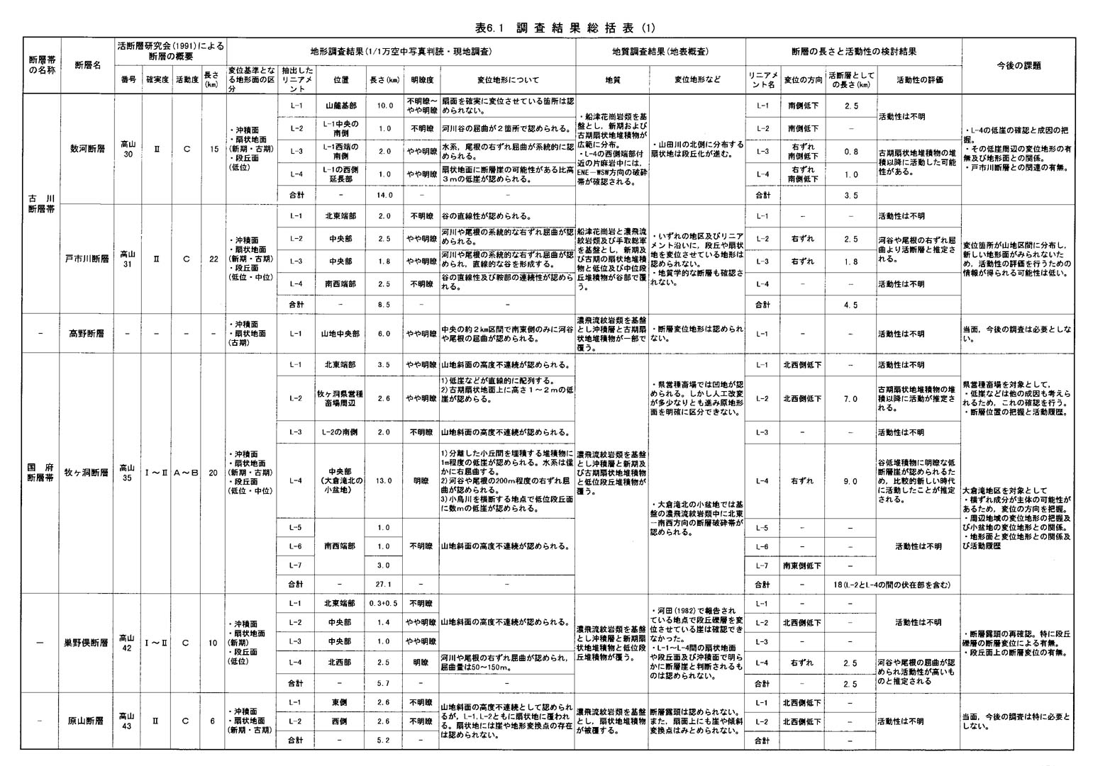 推定活断層の区間を含めた活断層の長さは活断層研究会(1991)で示されるものよりも全体に短く評価され,その総延長は約50kmとなった。その主な理由は,活断層研究会(1991)の断層崖としていた区間や変位地形の認められた区間に,明瞭な変位地形が認められなかったりして,活断層の疑いのあるリニアメントに評価を下げたためである。その区間は,数河断層の東部・戸市川断層の中央部・原山断層・巣野俣断層の北東部・宮川断層の北東部・大原断層の中央〜南西部・無数河断層の中央部である。