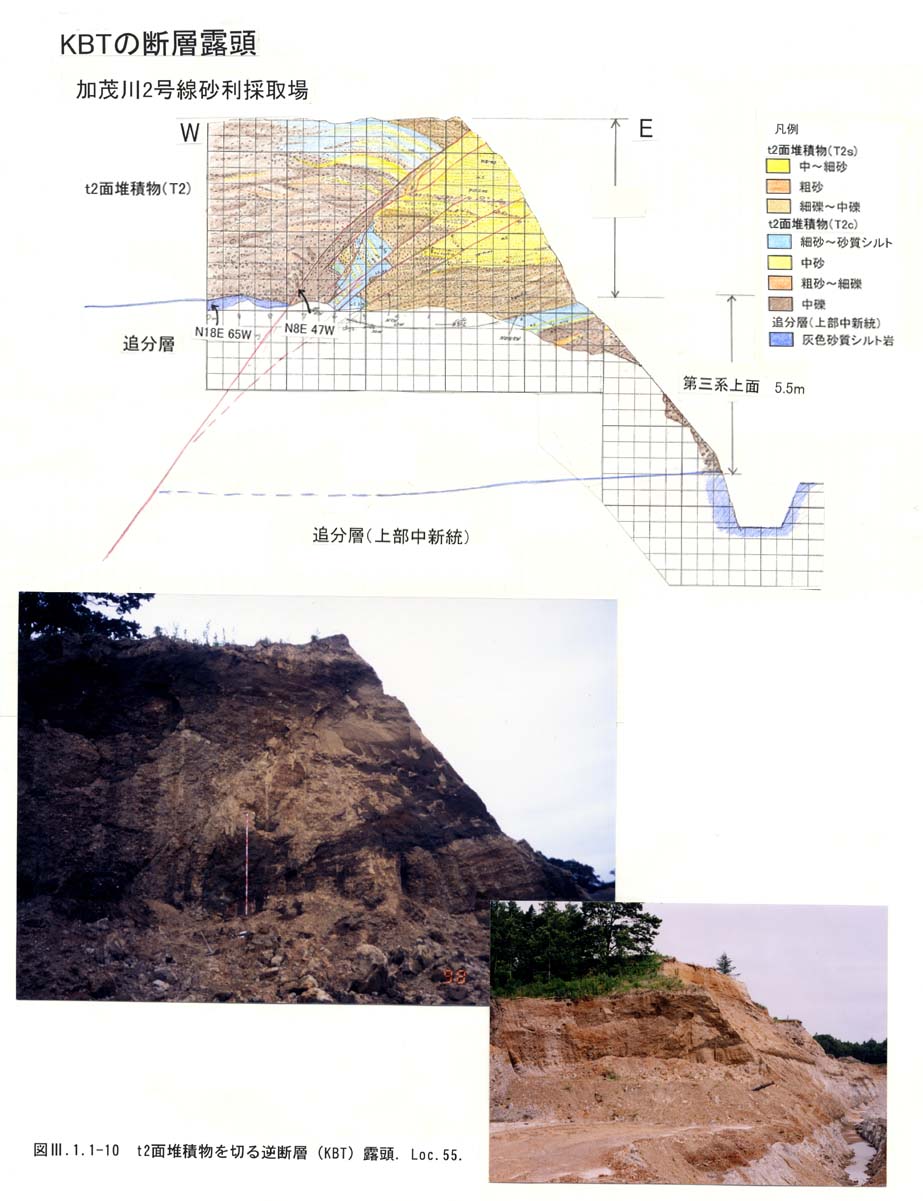 加茂川2号線砂利採取場(Loc.55): Loc.55では上部中新統追分層を覆ってシルト・礫層(T2c)および砂層(T2s)が分布する(図3−1−1−10).T2層基底は西傾斜の逆断層により約5.5m変位している.断層はT2層で分岐し緩傾斜となっている.断層面の走向傾斜はほぼ基盤の追分層の層理の構造に一致しており,この断層(KBT)は層面すべり断層と考えられる.土砂採取のため最新活動期や複数の活動イベントを示す現象はみられなかった.T2層基底の年代を200kaとすると,変位は5.5m/(200)kyr.であり,平均上下変位速度は概ね0.04m/kyr.である.