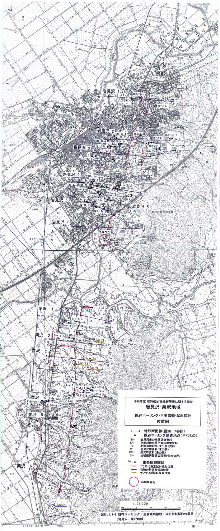 変位地形の簡易測量を行うとともに,栗沢町・岩見沢市の1/2,500都市計画平面図から地形断面図を作成した(図3−1−1−7−1、図3−1−1−7−2;図3−1−1−8−1、図3−1−1−8−2).