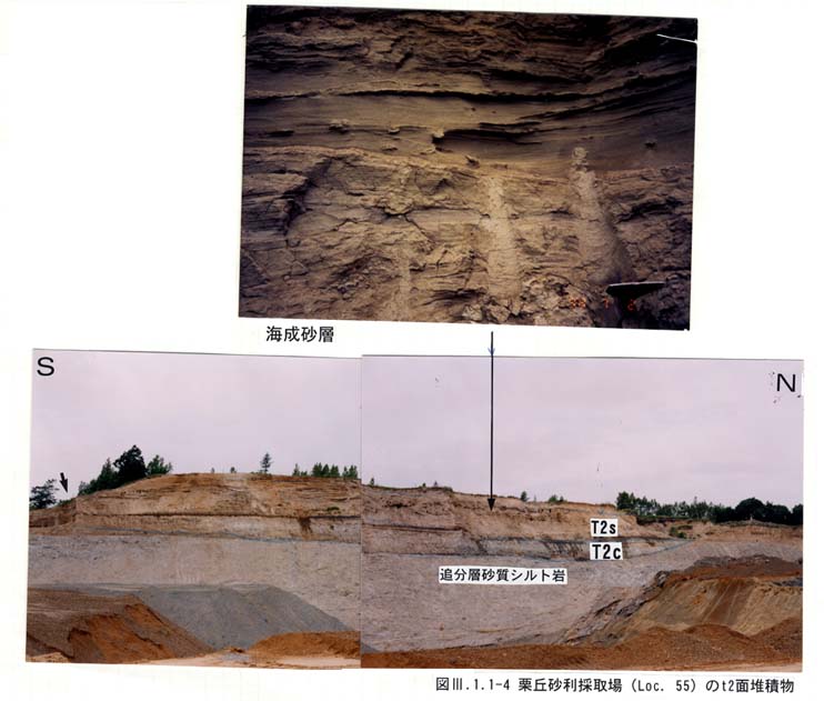 t2面堆積物(T2):t2面を構成する.第三系をほぼ平坦な不整合面をもって覆う砂礫・砂層(T2s)とその下位に谷埋め状に分布する砂質シルト・砂礫層(T2c)からなる(図3−1−1−4).T2s層は層厚3〜12m,中〜細粒の淘汰のよい砂を主体とし,中〜小規模なトラフ型斜交葉理や平行葉理が発達する.砂層にはしばしばサンドパイプが認められることから海成の砂層とみられる.T2cは有機質な暗青灰色の砂質シルトを主体とし,トラフ状の礫層を挟む.T2cの層厚は確認される限りで最大5〜6mである(Loc.55).砂質シルトには,しばしば植物片やクルミ球果を含み,花粉群集は冷温帯的で相対的な温暖期を示す(Loc.56,試料No.56:表3−1−1−3).露頭調査や既存ボーリング試料によればT2sの最高分布高度は60m前後である(図3−1−1−3,図3−1−1−8−1、図3−1−1−8−2).この地層は礫層(最大2m)を挟む灰色粘土層(全層厚4m)(TC)に覆われる.t2面は,後述のt3面の1つ前のステージの海成面であり,酸素同位体ステージ7(約200ka)あるいはステージ9(約300ka)の堆積物と考えられる.石狩低地東縁南部の早来層(馬追団体研究会,1983)に相当する.