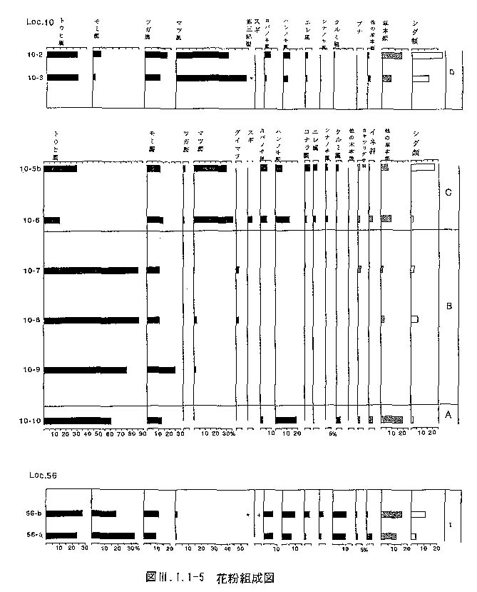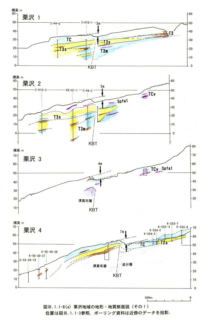 粘土質堆積物(TC):上記の各地形面,特にt2面,t3面には各面の堆積物を覆って通常3〜5m,確認されたうちで最大15m程度の層厚をもつ水成・風成の陸成堆積物が発達している.この堆積物の構成や年代のレンジは各面によって異なっているが,これらを便宜的に段丘面を被覆する粘土質堆積物TCと呼ぶ.大部分は粘土・シルト質堆積物であり,しばしば礫層や泥炭・有機質シルト層,火山灰層をはさむ.