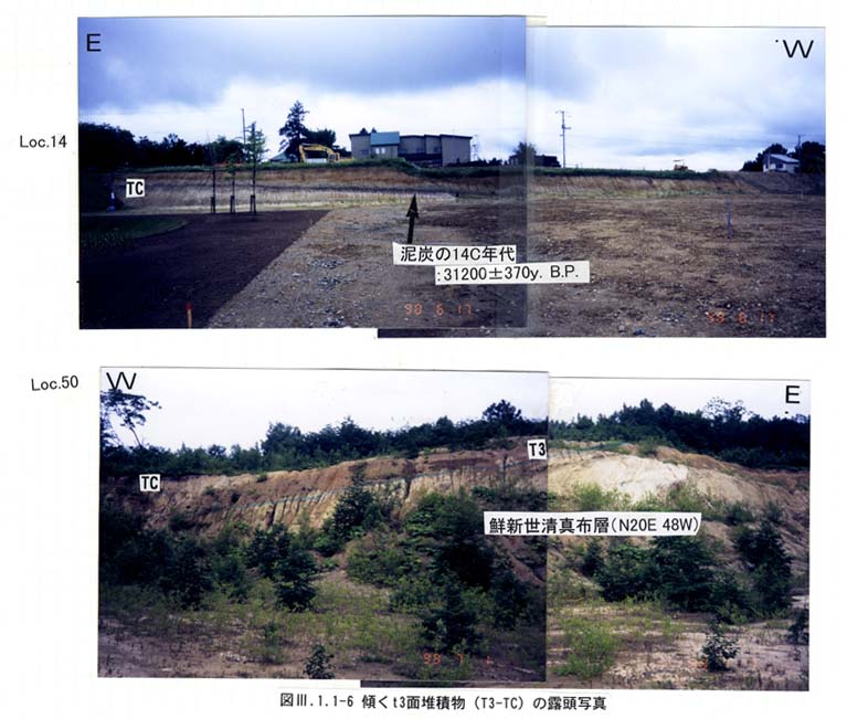 t3面堆積物(T3):t3,t3'面に分布する堆積物である.泥炭を挟む暗青灰色シルト層(T3m)と河成および海成の砂礫層(T3s)からなる.これらは,泥炭・砂礫層を挟む灰色〜灰白色シルト・粘土層(TCm)と支笏降下軽石1(Spfa1)の再堆積物を含む粘土層(TCv)におおわれる.基底部は砂礫からなり新第三系を不整合に覆う(Loc.17,Loc.10B).場所によってはt2堆積物を不整合に覆うものと推定される.