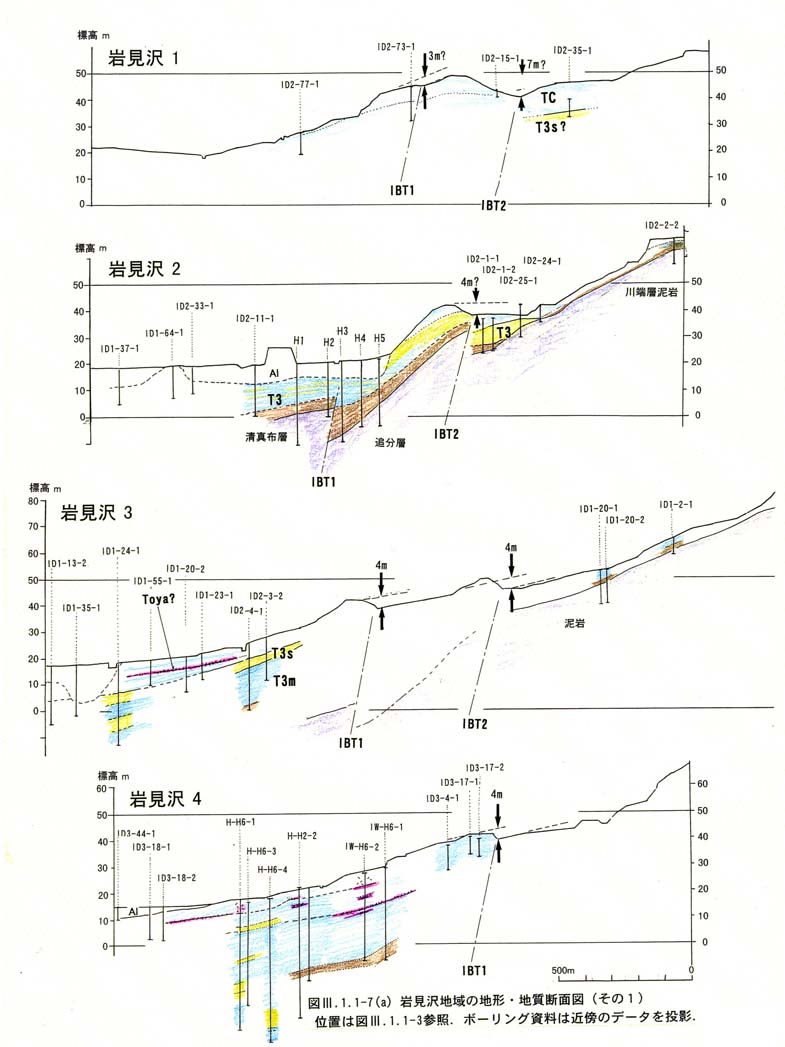 岩見沢地域の既存ボーリング資料によれば,t3'およびt3面では堆積物は連続的であり,第三系を基底礫層をもって覆う砂・シルト層(礫層を挟む)とそれをおおう火山灰の薄層に富む粘土・シルト・泥炭・有機質シルト層からなる.これらはそれぞれ栗沢地域のT3とTCに相当する地層と考えられる.T3の比較的淘汰のよい砂層の上限高度は,標高30〜40m程度であり(図3−1−1−7−1),栗沢地域のT3sと概ね一致する(なお,既存ボーリングデータ集では標高データを欠くものがあり,数mの誤差がある可能性がある).後述のように,本調査で実施したボーリング調査(緑が丘地区)ではt3'面を掘削し,T3の基底までの層序が明らかにされた.T3をおおう堆積物(TC)の最下部にはToyaテフラ(90−100ka)と厚真降下火山灰堆積物4(Aafa4)が含まれており,T3は最終間氷期(酸素同位体ステージ5e:125ka)の堆積物と考えられる.これらは石狩低地東縁南部の厚真層(馬追団体研究会,1983)や野幌丘陵のもみじ台層(矢野,1983)に対比され,海成堆積物の分布高度もそれらの地層と大まかに一致する.