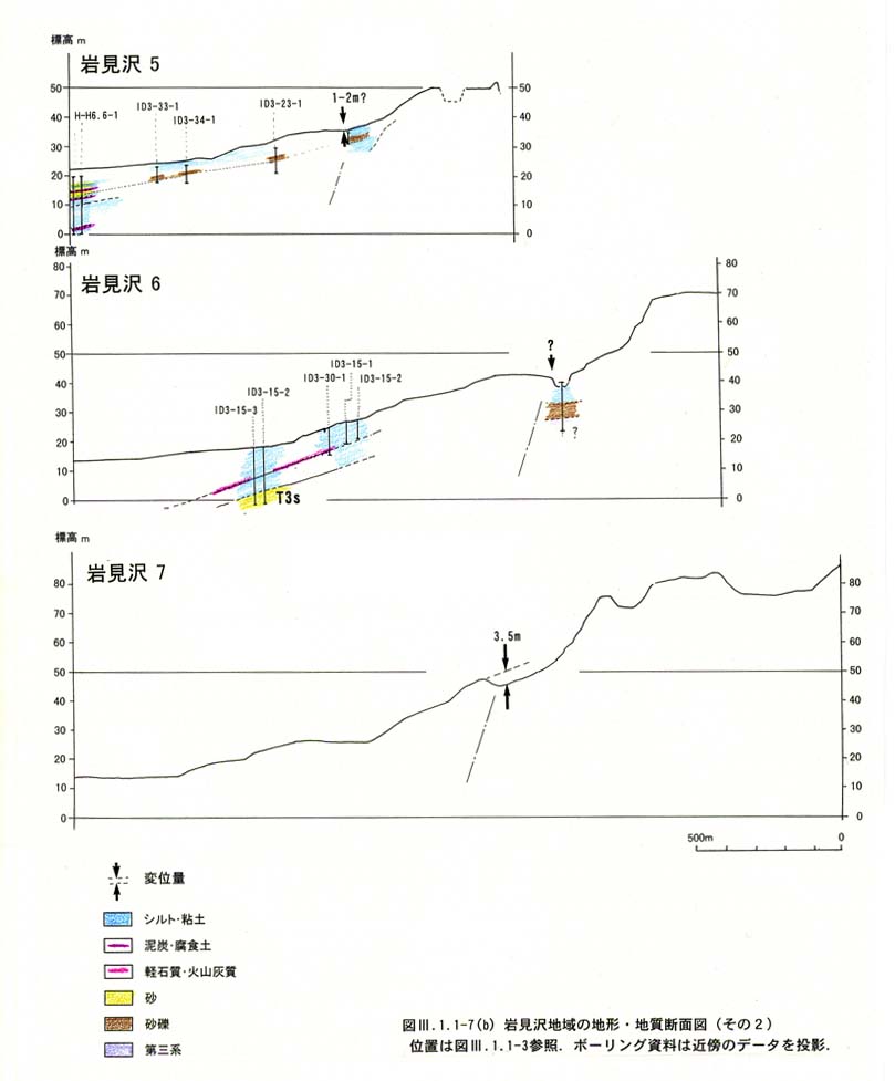 岩見沢断層と栗沢断層の主撓曲崖の比高はt3面でおおむね20m程度である.t3面の年代を125kaとすると,平均変位速度は概ね0.1〜0.2m/kyr.以上とみられる.地層の連続性から見ると撓曲構造というよりはむしろ傾動に近い.断面図をみると岩見沢地域のt3面とt3'面は,本来は同じ面で,撓曲により面の傾斜が大きくなった面がt3面ともとらえられる.
