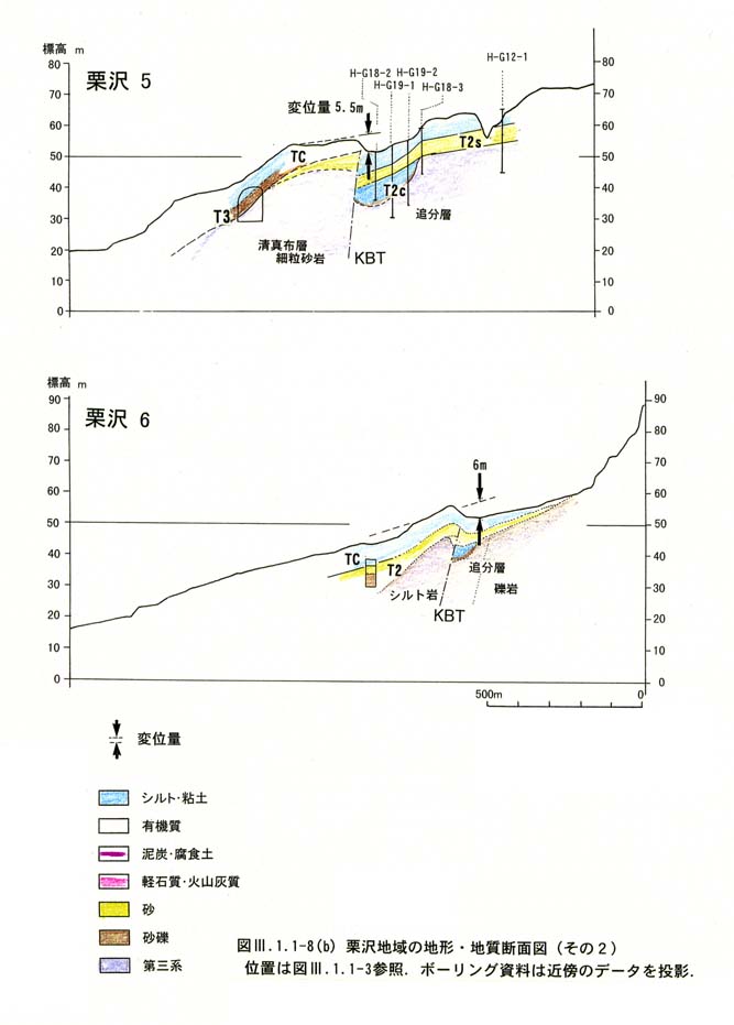 地形判読の項で述べたように,逆向き小崖の山側にはトラフ状の凹地が認められる.既存ボーリング資料によればこの部分には,T2cやTCの谷埋め堆積物が分布する(図3−1−1−8−1、図3−1−1−8−2).したがって,これらは断層崖に沿って形成した古い埋積谷(現在で言えば,たとえば馬追断層のフモンケ川の谷)の跡とみられる.つまり,崖の見かけの変位量にばらつきがあるのは,侵食と埋積によって実際の変位量が修飾されているためと考えられる.