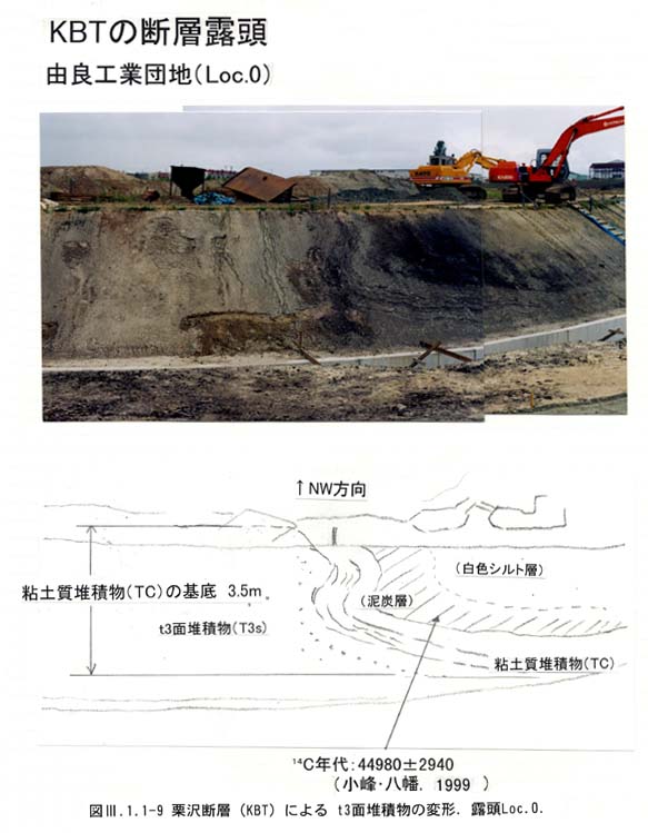 由良工業団地東側(Loc.0): 小峰・八幡(1999)が記載した露頭である.調査者の一人田近が八幡の案内によって観察した(図3−1−1−9).ここでは砂礫層(T3s)を覆って有機質粘土層,泥炭層,灰色粘土層(TCm)が分布する.断層は確認できないが,これらは明瞭な東下がりの撓曲変形を示す.泥炭層の上下変位量は約3.5m(法面の比高は3.2m)であり,泥炭中の材の年代は14C(AMS)年代は44,980±2,940y.B.P.(小峰・八幡,1999)である.したがって,平均上下変位速度はLoc.0で約3.5m/45kyr.から0.07m/kyr.(C級上位)となる.