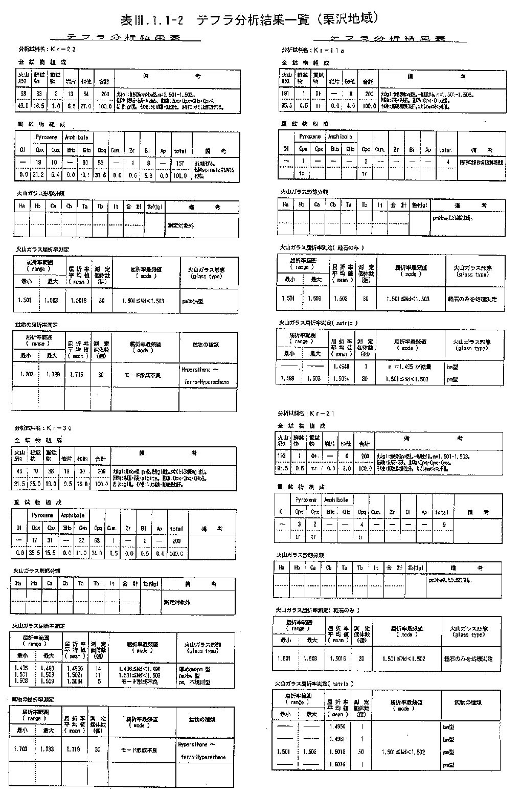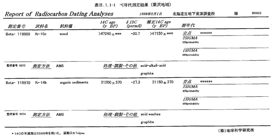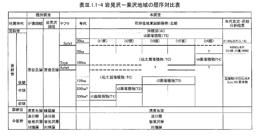 栗沢地域のT3の上位に発達するTUは,層厚3m〜10mであり,上半部にSpfa1テフラ(約40ka)の軽石を含む礫層やこれを散点的に含むシルト層が発達する.再堆積テフラの一部にはToyaテフラの混合を示唆するような低屈折率の火山ガラスを含むものがある(Kr30:表3−1−1−2).上部の有機質粘土層(Loc.14:図3−1−1−6)からは31200±370y.B.P.の14C(AMS)年代が得られた.またT3直上の泥炭層の木片からの14C年代(AMS)は45,010±2,940y.B.P.である(小峰・八幡,1999).