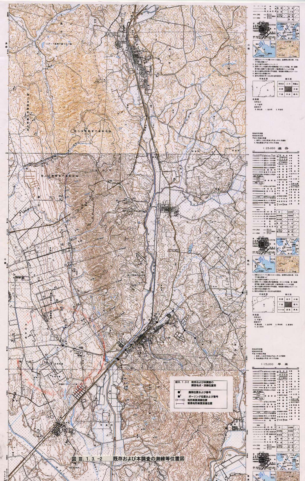 既存ボーリングの位置(図3−1−3−2)および柱状図を示す(図3−1−3−3).ほとんど河川付近で調査が実施されているため,沖積層が被覆する.注目すべきは,沖積層と新第三系の基盤岩類(砂岩または泥岩と記載されている)の間に,シルト層または粘土層で特徴づけられる更新統が存在することである.また,更新統は基底高度から2つに区分される.馬追団体研究会(1983)から,高位の更新統は早来層に,低位の更新統は厚真層に対比されると考えられる.