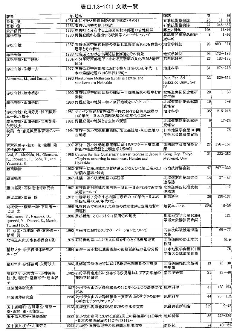 馬追団体研究会(1983,1987)は,本地域を含む厚真―由仁―安平に分布する第四系の層序の再検討を行なった.藤田・石狩低地帯研究会(1967)の層序のニタッポロ層,美里層および下安平面層の一部をあわせて早来層,下安平面層の一部を厚真層,汐見層のうち風成テフラを除いた泥炭を主とする部分を本郷層と再区分し,さらに鵡川・支笏・恵庭・樽前降下軽石堆積物,段丘堆積物(宇隆段丘堆積物,美里段丘堆積物)に覆われる層序を示した.早来層と厚真層は不整合関係,厚真層と本郷層は整合関係である.このうち,本郷層には,Aafa−1〜4のテフラを挟むことが確認された.このうち,Aafa−1はKt−8に,Aafa−2はToyaに,Aafa−3はKc−Hb(Kc−4)に対比される(表3−1−3−2を参照).