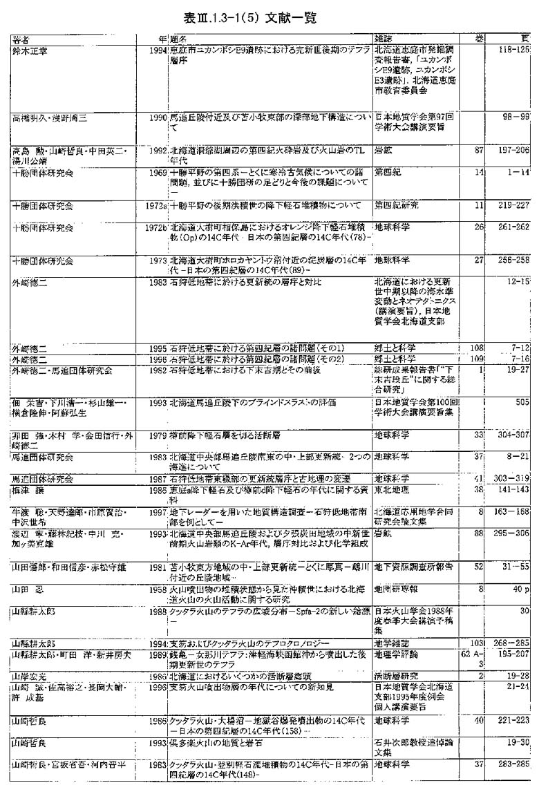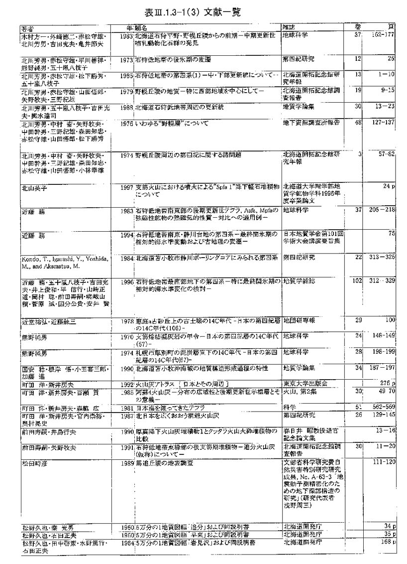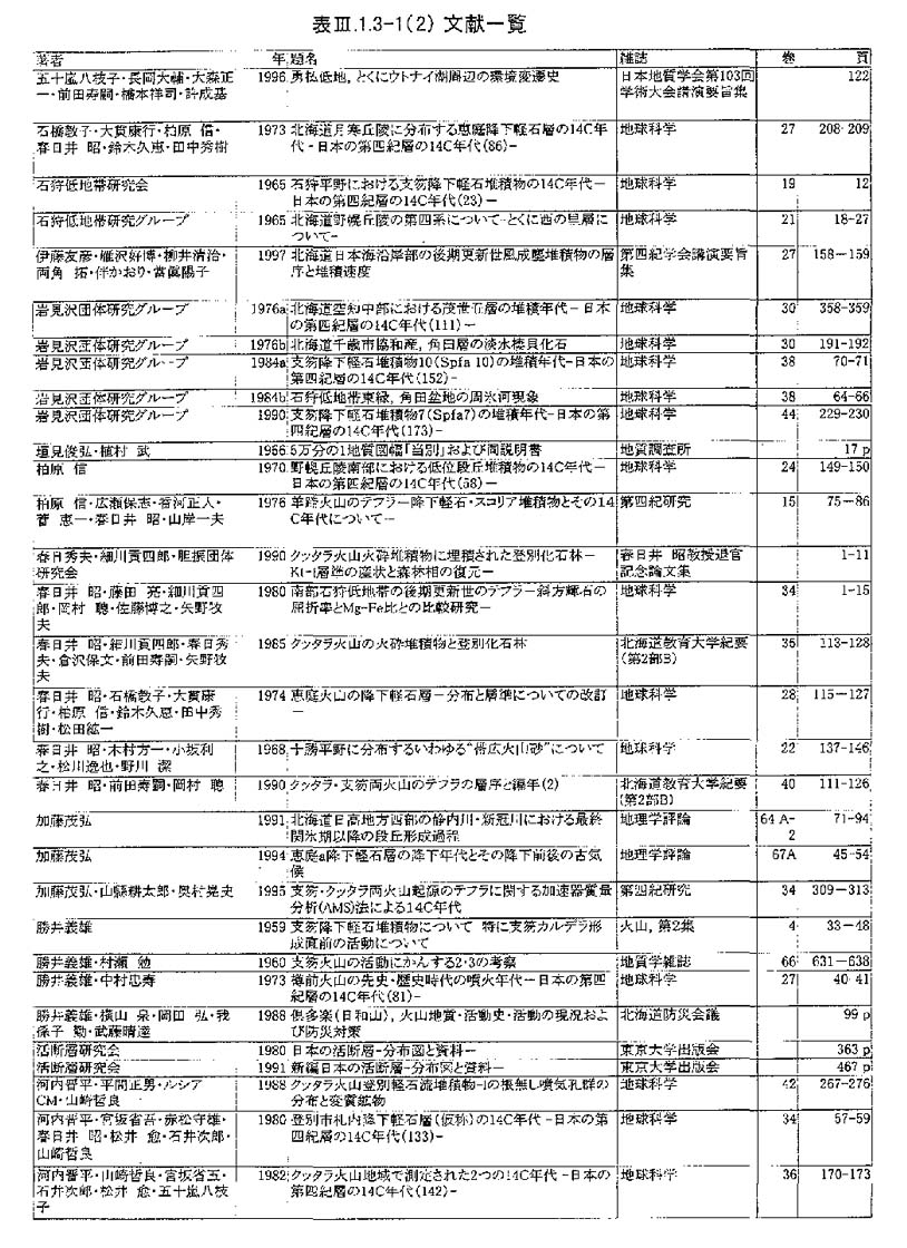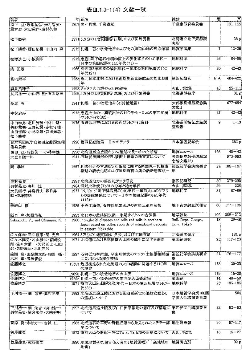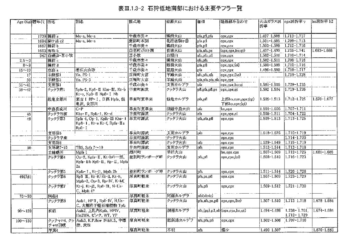 調査地域周辺には,支笏カルデラ・樽前火山・クッタラ火山群に由来する降下火砕物・火砕流堆積物などのテフラ,およびより遠方の第四紀火山(屈斜路カルデラ,阿蘇カルデラ,白頭山)からもたらされた広域テフラが厚く堆積している(春日井ほか, 1980;山縣, 1994;町田ほか, 1985; 町田ほか, 1987;町田・新井, 1992など).それぞれのテフラは,地質学的時間スケールにおいてほぼ同時(数時間〜数日)に広範囲を覆うため広域的な等時間面として追跡できる.今回,地形面区分および第四紀地質層序を確立するため,活断層のイベント発生時期・活動履歴を評価するために,特にテフラ層序に注目して地形地質調査を行った.図3−1−3−1に,調査地域内に分布する第四紀後期以降の火山噴出物の模式柱状図,表3−1−3−2に年代・別名・記載岩石学的特徴を,表3−1−3−3−1、表3−1−3−3−2にこれらの噴出物についてこれまで報告されている放射年代値を示す.以後,テフラ名は表3−1−3−2に示した略記号で記述する.