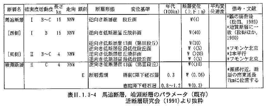 早来・厚真地域に分布する活断層は,NNW走向に並列する馬追断層(東側:15km,西側:4km)と嶮淵断層(4km)が知られている(活断層研究会,1991).これらの断層の記載は,卯田ほか(1979),活断層研究会(1980),山岸(1986),松田(1989)によって行なわれ,活断層研究会(1991)によって整理された.活断層研究会(1991)に基づく断層パラメータを示す(表3−1−3−4).