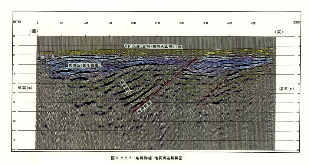 測線上200〜300m区間では,先の火山噴出物層の下面に相当する反射面が不明瞭となっている.新第三紀層(追分層)に対比される上面境界は,測線上200〜300m区は,その前後に比べて出現深度が浅くなっており,泉郷断層の活動様式を示唆するものとも推察される.しかし,これだけでは,単なる堆積環境による変化なども否定できず,ボーリング調査などを実施して,地質構造を詳細に把握する必要がある.