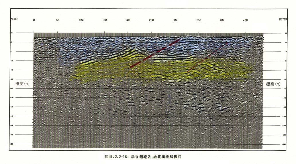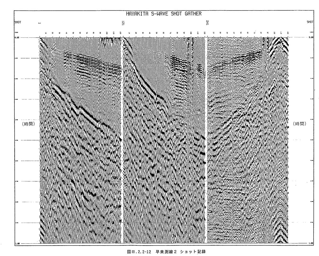 標高−50m以深では,有意な反射面は見受けられない.現地測定記録では,直接波・屈折波が概ね200m程度離れた受振器まで届いていたことから,深度約100m程度までの反射データは取得可能と考えられる.したがって,標高−100m付近までは新第三紀層内に明瞭な反射境界はないのではと推察される.