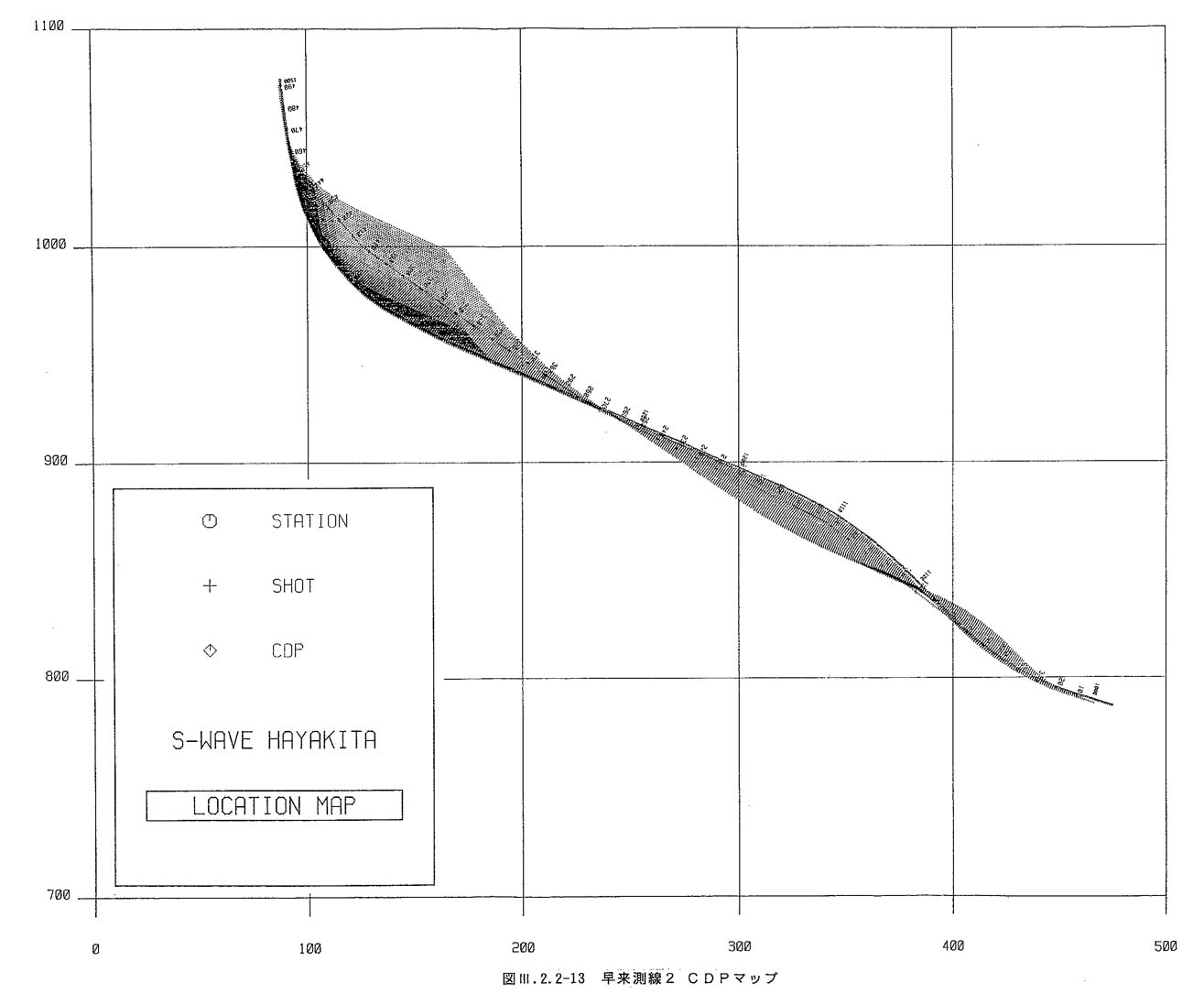 測線は屈曲しているため,受振点と発振点の中点を示す共通反射点(CDP)は現地測線上からはずれるところが生じた.したがって,CDPが分布する地点に仮想ラインを定義して処理を行い,図3−2−2−13にCDPマップと仮想ラインを示す.反射断面図は,仮想ラインの直下の断面であるため,図に示された距離程は仮想ラインから最も近い現地測線距離(m)を示していることに注意する必要がある.