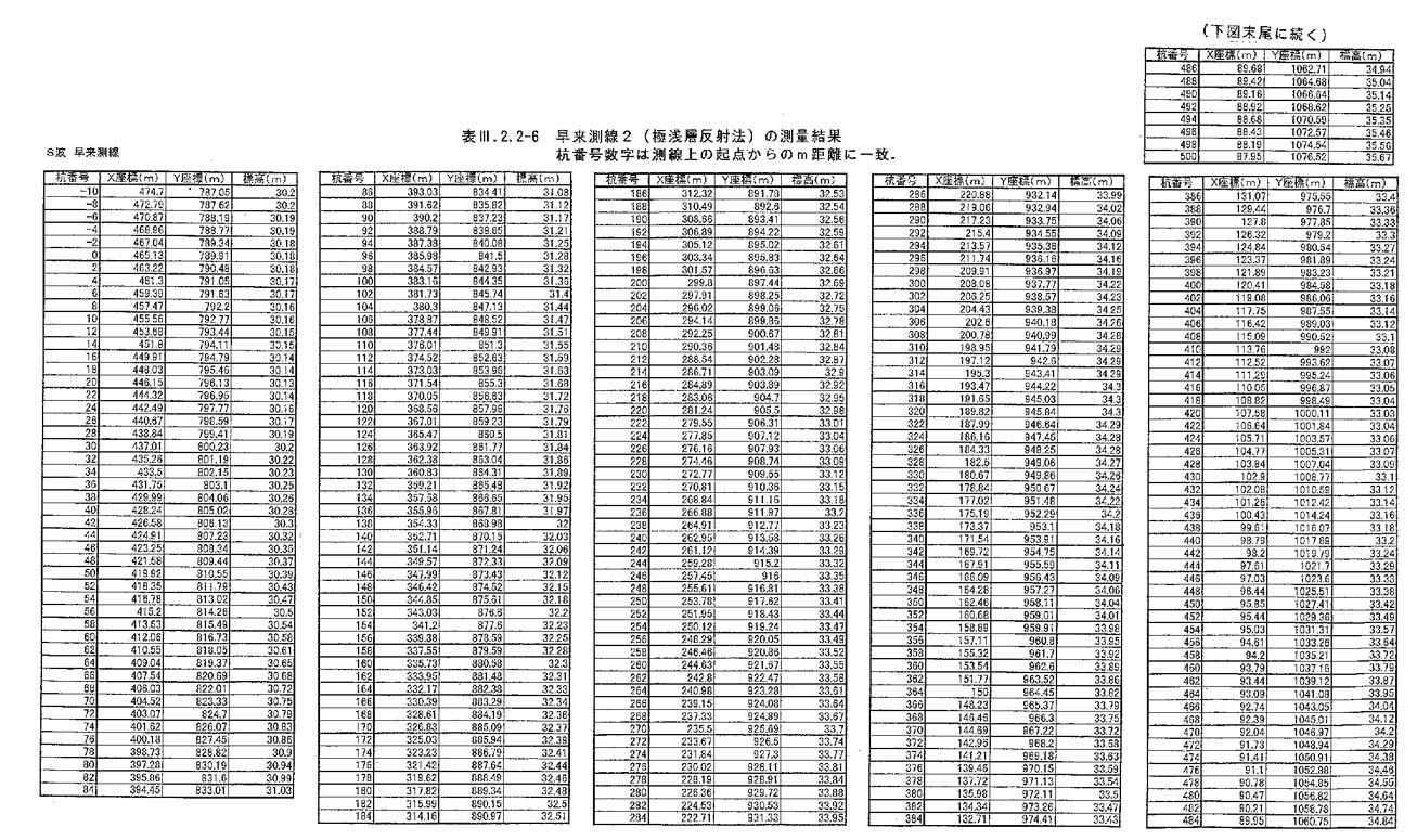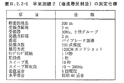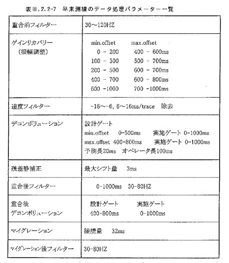 データ処理で用いた各種フィルター等のパラメータを表3−2−2−7に示す.処理結果は,マイグレーション前時間断面図,マイグレーション後時間断面図,マイグレーション前深度断面図,マイグレーション後深度断面図として解析した.