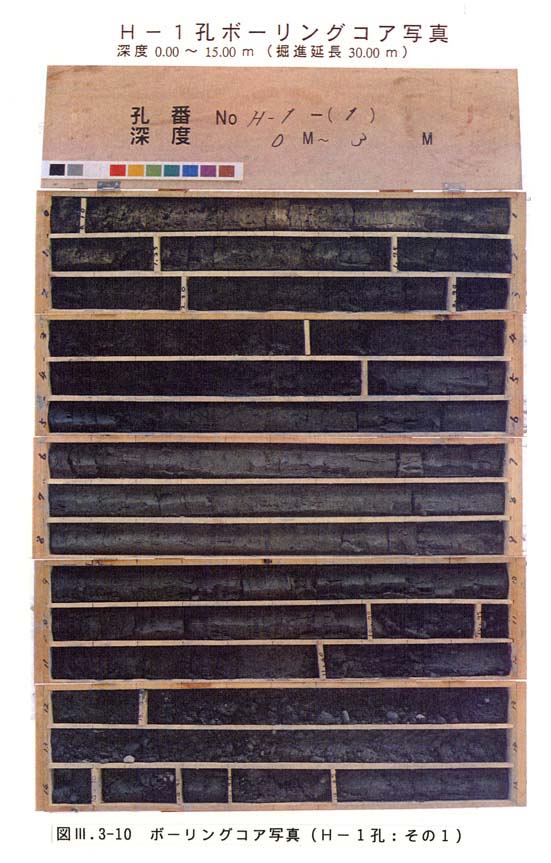★0.00〜7.25m:大局的には上部は粘土,下部は砂からなる.全体にやや軟質で腐植質である.4.46〜4.75mに火山灰質砂が挟在し,5.40m付近には腐植物が比較的多く含まれている.沖積層に相当するものと判断される.