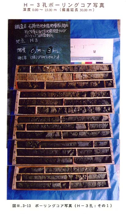 ★18.50〜30.00m:灰色を呈する均質な砂岩からなり,部分的に雲母片を含む.新第三系鮮新統の清真布層(峰延層)に相当する地層であると判断される.