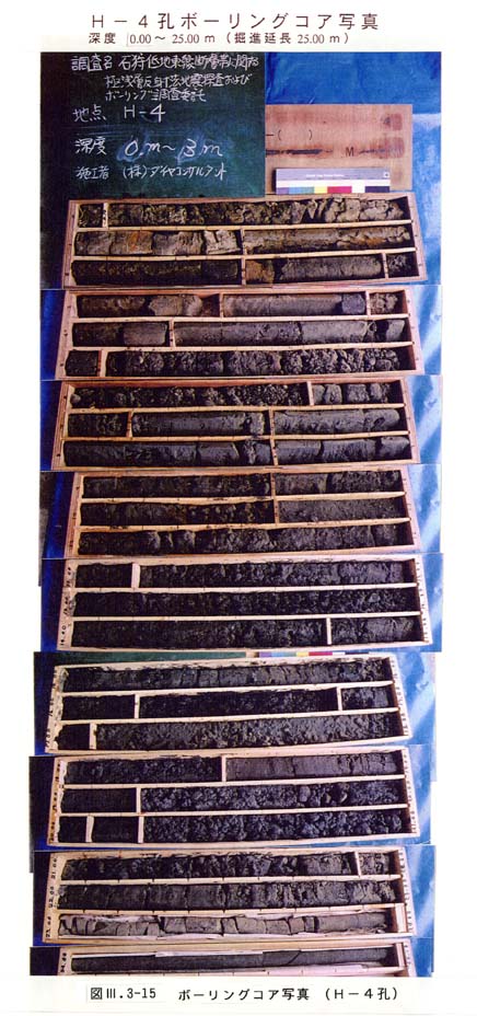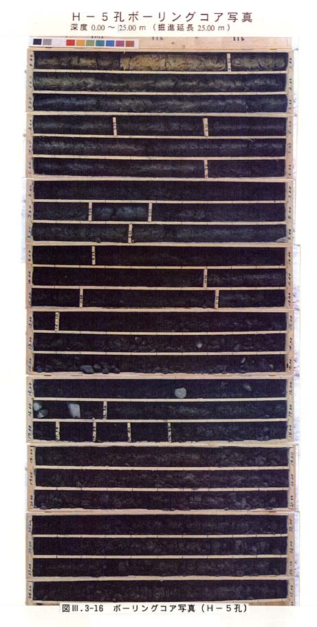 ★16.50〜25.00m:主として暗灰色を呈する泥岩からなる.上部に層厚15p程度の暗灰色砂岩を2層挟在するる.新第三系中新統の追分層に相当すると判断される.
