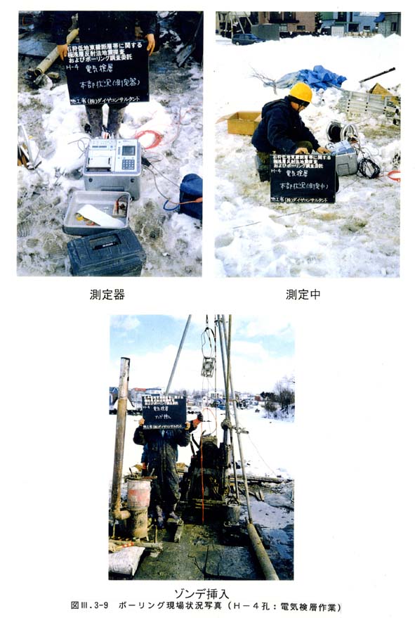 H−3孔の東側72.0mの地点で,断層の下盤側を掘削した.粘土〜シルトについては三重管を用いて,砂〜砂礫については無水掘削によりコアを採取した.本孔については,日の出地区のリニアメント東側(断層下盤側)の代表孔として電気検層を実施した(図3−3−8).