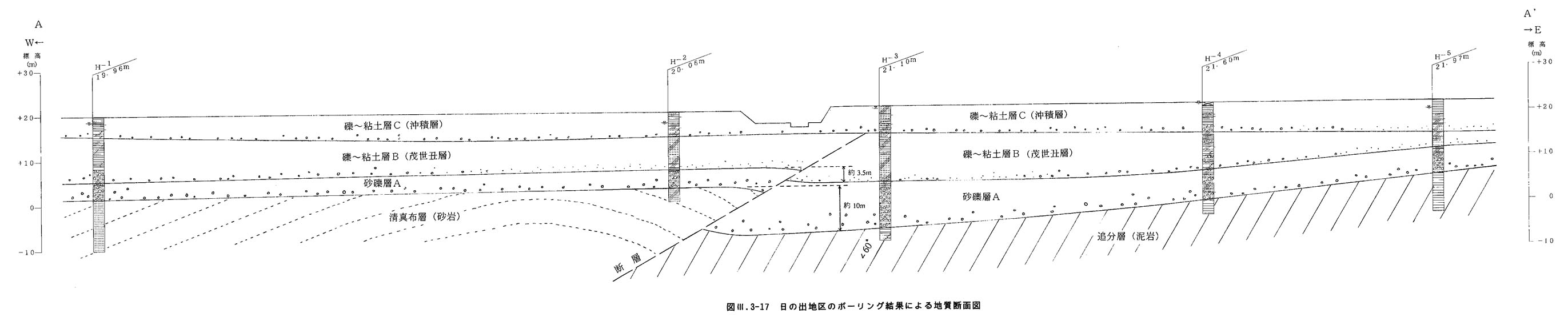 B)地質構造的には,新第三系の追分層は西側に60゚程度で傾斜していると判断される.清真布層の構造は不明であるが,緑が丘地区と同様に撓曲している可能性が考えられるる.新第三系を直接被覆する更新統は,西側に数度程度の極緩い角度で傾斜している.最上位の沖積層はほぼ水平に堆積している.