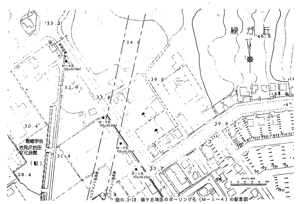M−2孔の北西側43.0mの地点で,リニアメント西側を掘削した.粘土〜シルトについては三重管を用いて,砂〜砂礫については無水掘削によりコアを採取した.本孔については,緑ケ丘地区のリニアメント西側の代表孔として電気検層を実施した.