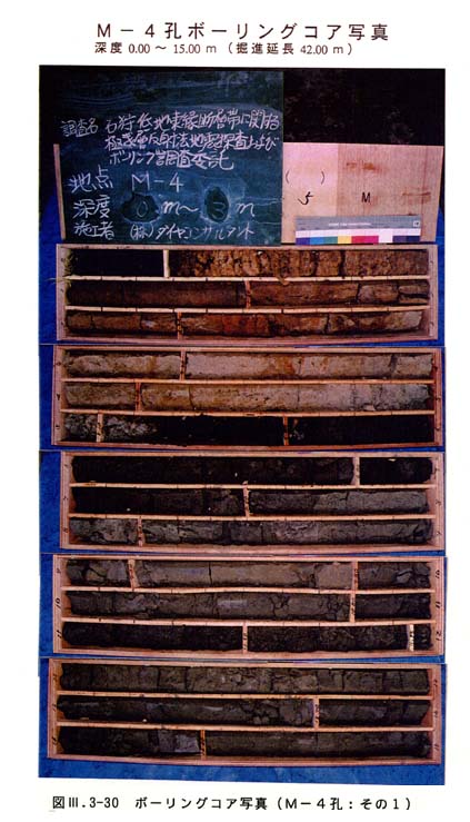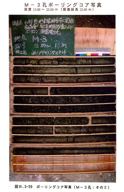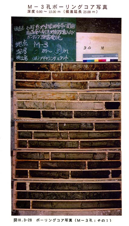 M−3孔の北西側94.0mの地点で,リニアメントの西側を掘削した.粘土〜シルトについては三重管を用いて,砂〜砂礫については無水掘削によりコアを採取した.