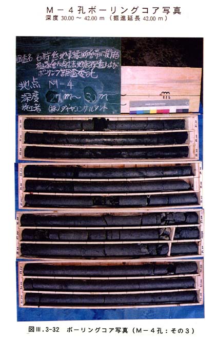 ★0.00〜19.90m:上部は主として褐灰色〜暗灰色を呈するシルト〜粘土からなり,下部は砂礫からなる.11.15〜11.95m間に砂〜砂礫層を挟在する.上部のシルト〜粘土のうち0.30〜5.26m間は全体に火山灰質で,直下に腐植土あるいは有機質粘土を伴う.2.70〜2.75m,3.60〜4.25m,4.70〜5.00mには火山灰が挟在している.このうち4.70〜5.00mのものは淡黄灰色(下部は緑灰色)を呈する細粒ガラス質火山灰で洞爺(Toya)に対比される可能性がある.下部の砂礫層を構成する礫は,安山岩,砂岩,頁岩,凝灰岩,花崗岩等で,礫径は5〜50o程度で,礫含有率は60〜70%を示す.地層の年代などの判断はM−3の0〜21.75m間と同様である.