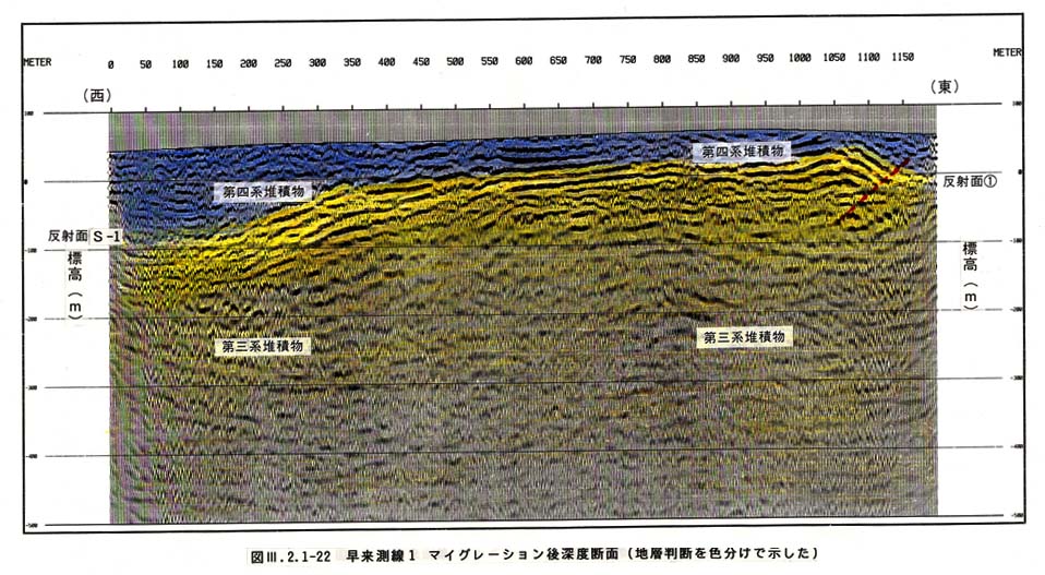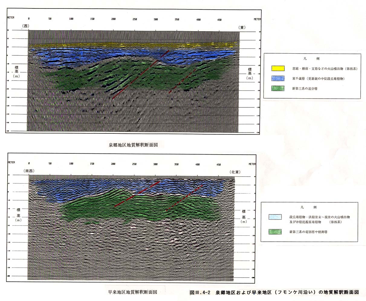 早来測線2(極浅層反射法)では地表下20〜30m付近に明瞭な反射面が得られたが,これは早来測線1と同様に新第三系と第四系の境界と判断される(図3−4−2下段図).上位を占める第四系は測線の中央部付近で顕著な隆起構造(東急西緩)を示している.この構造の内,東翼の急傾斜部は地表部の逆向き低崖と比較するとやや西にずれているが,それは低角逆断層が存在していると解釈される.第四系は厚さが20〜30mとみなされるが,反射パターンにより大きく3分できる.すなわち,上位より,表層付近に途切れ状に存在するパターンの明瞭な部分,パターンのやや不明瞭な部分,下部のパターンが明瞭で上記の隆起構造を明瞭に示す部分である.これらは周囲の地表地質状況から判断すると上位より,現河川沿いの沖積層,恵庭・支笏火山噴出物および段丘堆積物に対応している.