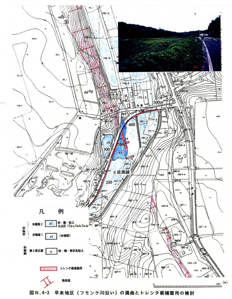 早来測線1・2で解析の主対象とした馬追断層aは自衛隊駐屯地内での調査などから,少なくとも恵庭a火山灰までを巻き込んで活動していることは確実で,泉郷断層と類似の活動をしていると判断される.これらのことから,地形地質調査で指摘されているより新しい活動の存在を確認するためには,河川沿いなどの堆積物・地形調査をする必要がある.図3−4−3に示すように,フモンケ川が馬追断層aを横切る所では,沖積面1(a1;高位のもの)に撓曲が認められており,新しい断層活動の証拠ではないかとして注目できる.そのため,付近で前段調査として群列ボーリングを実施し,沖積面1の撓曲部およびより低位の現河川氾濫原面(沖積面2)を対象として大小のトレンチによる調査を実施することが適当と判断される.