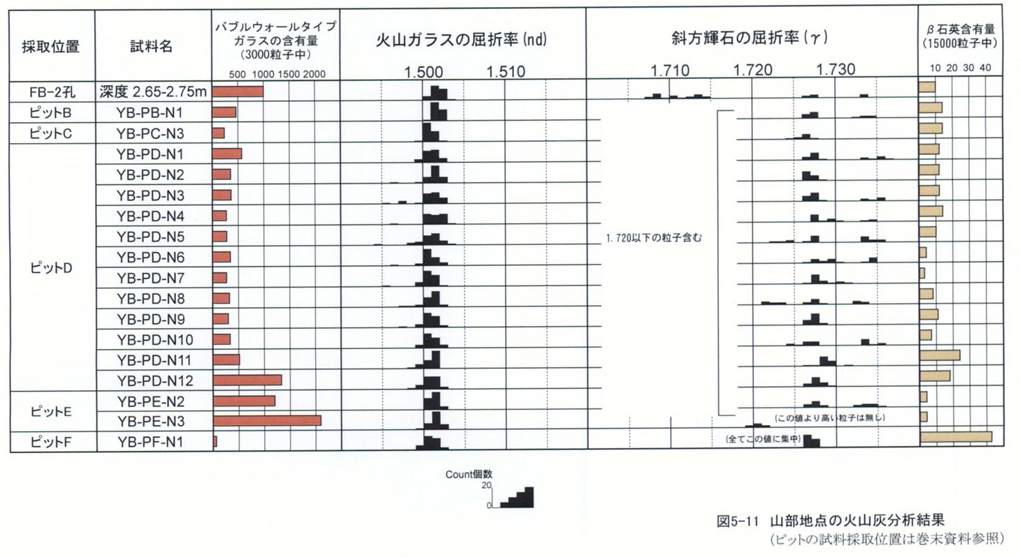 土石流堆積物は赤褐色を呈するローム質シルト層,亜円〜亜角礫層,砂層,シルト質礫層からなり,淘汰は極めて悪い.ピットD及びピットEでは,挟在するシルト層,礫層が著しく乱れた構造を示しており,この構造はインボリューションによるものと推定される.最下部のシルト質礫層は,ピットB及びその東側のピットに分布する.また,本堆積物の下部には,細粒火山灰層〜火山灰質シルト層が挟在しており,その層相や屈折率の特徴などから,支笏第1テフラ(Spfa−1:40ka〜45ka:新編火山灰アトラス,2003)に対比される(図3−5−11).