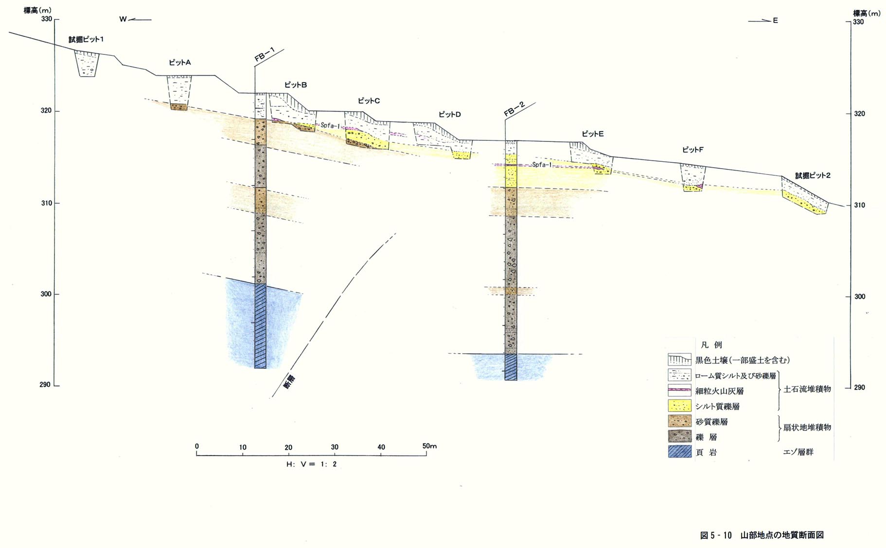 また,FB−2孔では,深度2.65m〜2.75mに細粒火山灰層が挟在しており,同火山灰層は,層相や屈折率などから支笏第1テフラ(Spfa−1:40ka〜45ka:新編火山灰アトラス,2003)に対比される(図3−5−11).FB−2孔におけるSpfa−1とピットで確認された同テフラの高度を比較すると,約2mの高度差があり,この高度差は断層による変位の可能性がある.