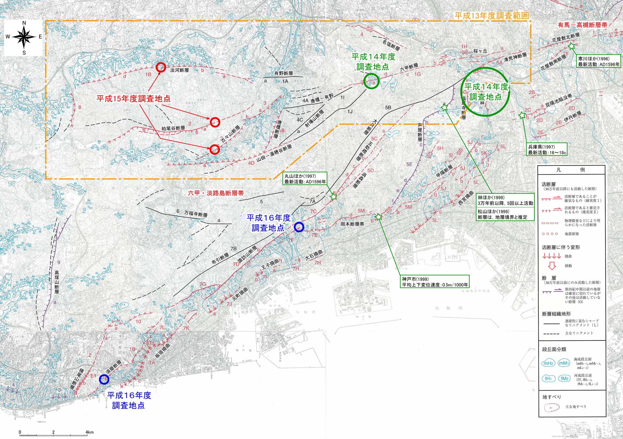 平成16年度における活断層調査の対象断層は,六甲・淡路島断層帯北部地域に分布する活断層のうち,