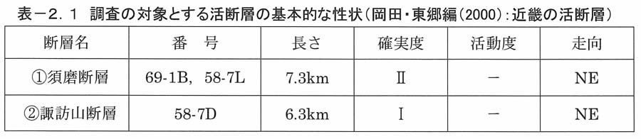 に示す須磨断層および諏訪山断層などの六甲山地南縁を通る断層である。各断層の基本的な性状を